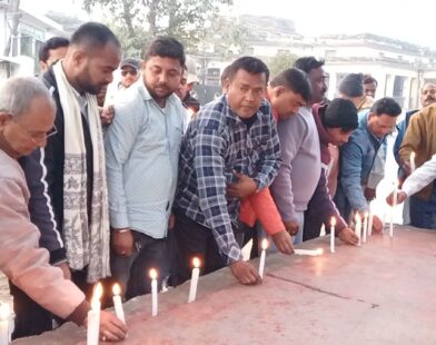 6 साल की बच्ची से दुष्कर्म व हत्या पर राज सर्वें कार्यालय परिसर मे आयोजित श्रद्धांजलि सभा में कैण्डल जलाकर एवं दो मिनट का मौन रख श्रद्धांजलि दी गई